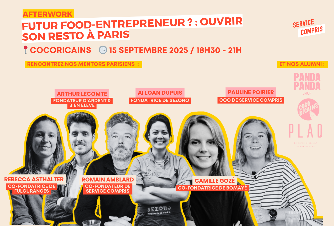 Julien Fouin & Ludovic Dardenay (co-fondateurs de Service Compris et de la Vertigo Family), Romain Amblard (co-fondateur de Service Compris et de L'auberge des Isles), Pauline Poirier (ex-restauratrice de 4 établissements Maison Plisson), les mentors Service Compris Paris, seront là pour vous guider. Julien Chavane et Stéphane Darras (Notre Dame), anciens alumni Service Compris, vous donneront leurs clés de la réussite.
